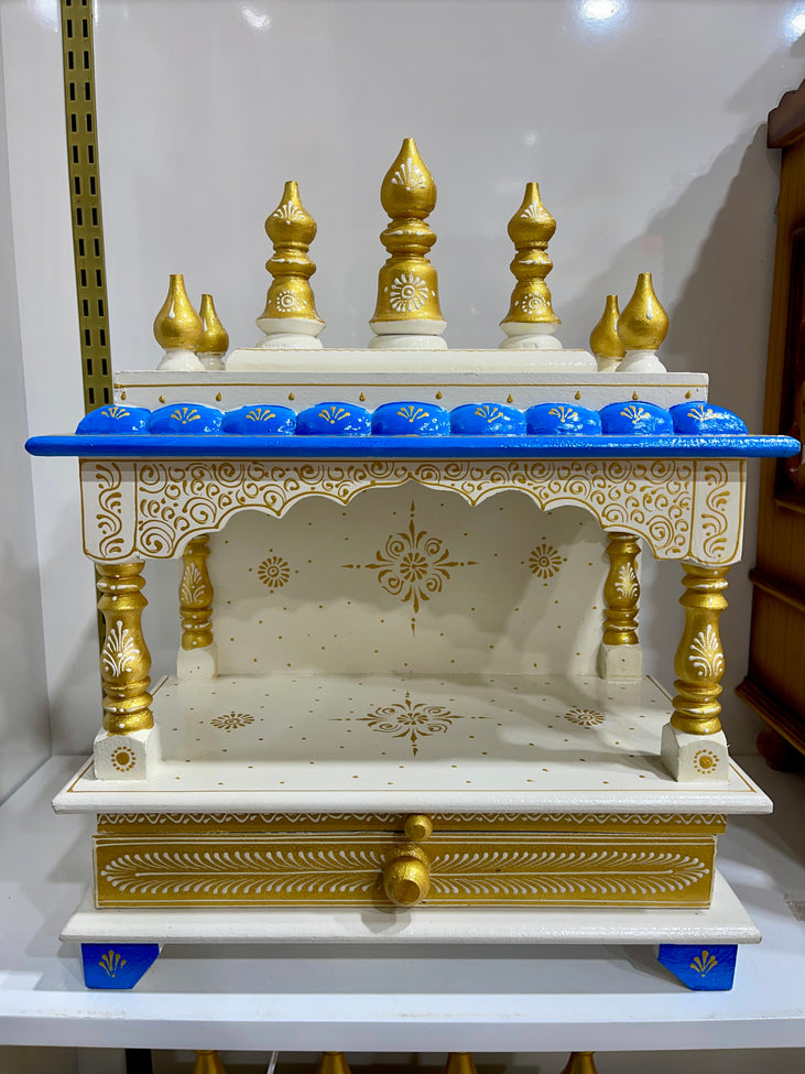 • Spacious Drawer: Includes a pull-out drawer with golden accents for storing essential Puja items.