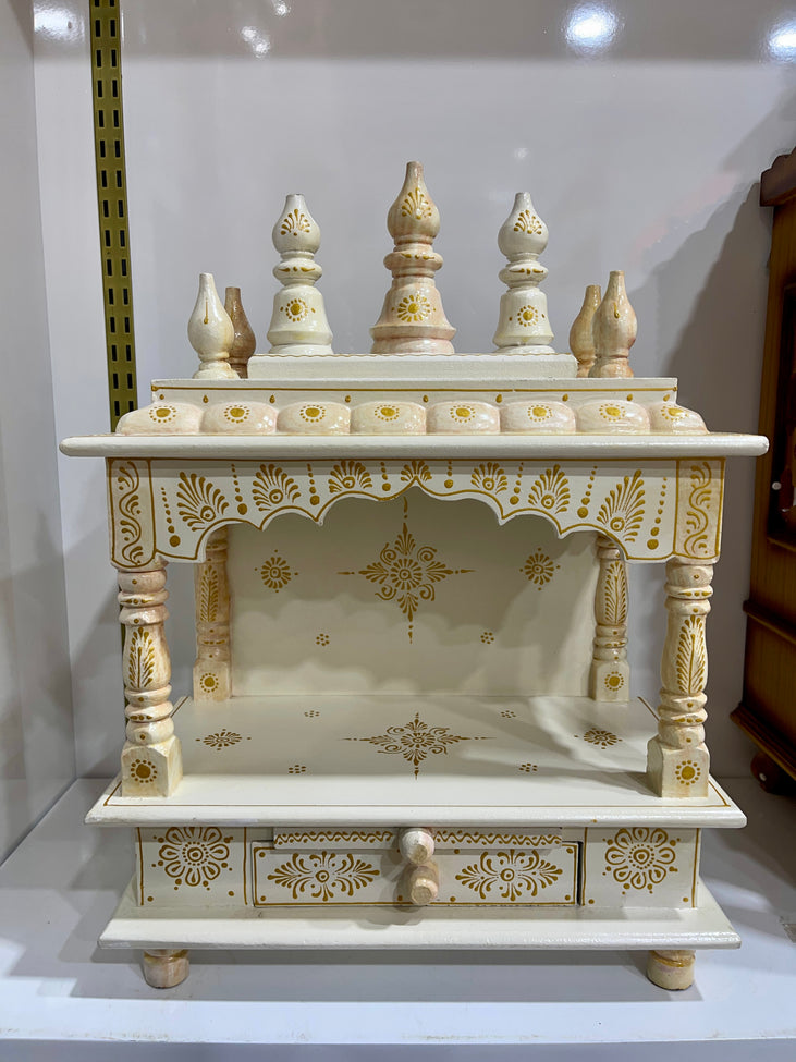 • High-Quality Solid Wood with White and Gold Finish: Handcrafted in India, this Mandir is designed for elegance and durability, bringing a timeless beauty to your home.