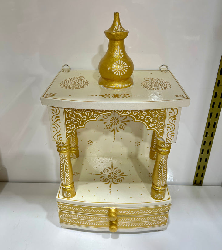 Compact White and Gold Wooden Mandir without Doors